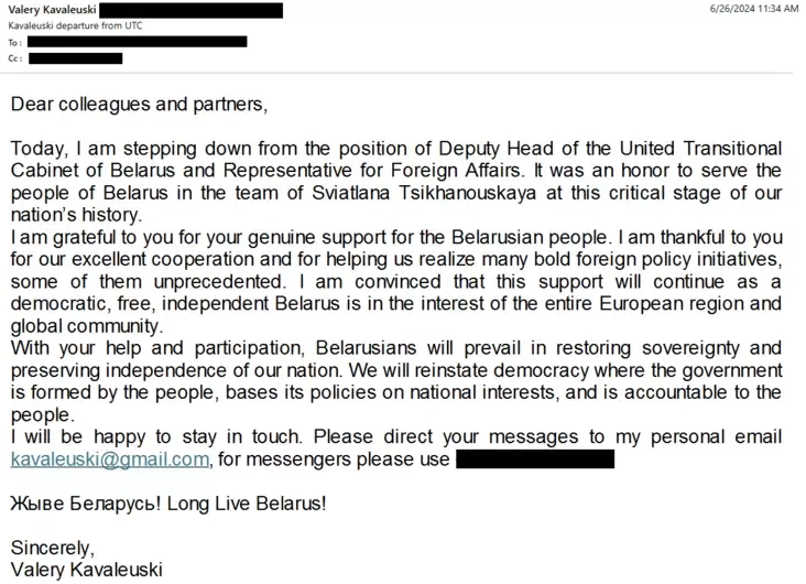 Приведенная в статье издания The Grayzone переписка происходила 1‑3 июня 2024 года. 26 июня 2024 года Валерий Ковалевский объявил о своей отставке. Технически доступ к почте сохранялся за ним на срок, необходимый для передачи дел».