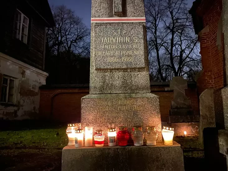 У памятника возрожденцам, создателям «Нашай Нівы» Ивану и Антону Луцкевичам. Это кенотаф, на самом деле Иван Луцкевич похоронен на кладбище в польском Закопане, а Антон Луцкевич — в неизвестном месте в Саратовской области России