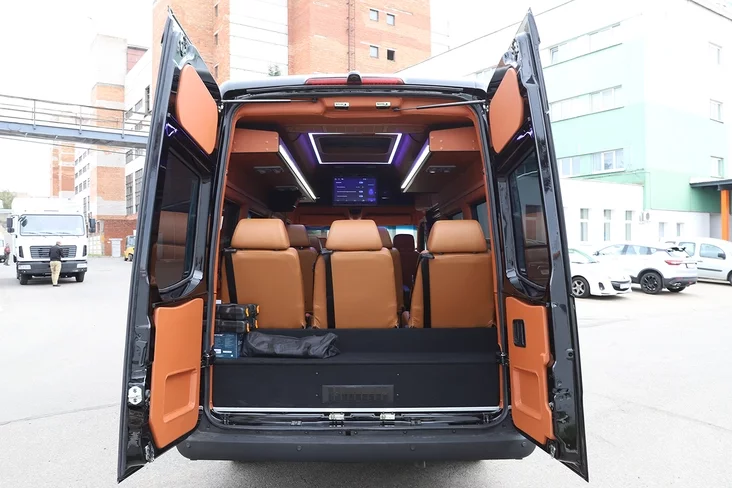 Просторный салон имеет 7 кожаных кресел повышенной комфортности с функцией откидывания назад, телевизор, систему сенсорного управления аудио и видео, откидной столик, полки для размещения личных вещей, USB-разъемы, подстаканники.