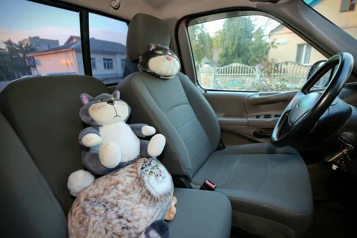 В кабине пикапа… котики. Оказывается, хозяйка решила доработать интерьер.