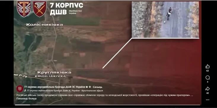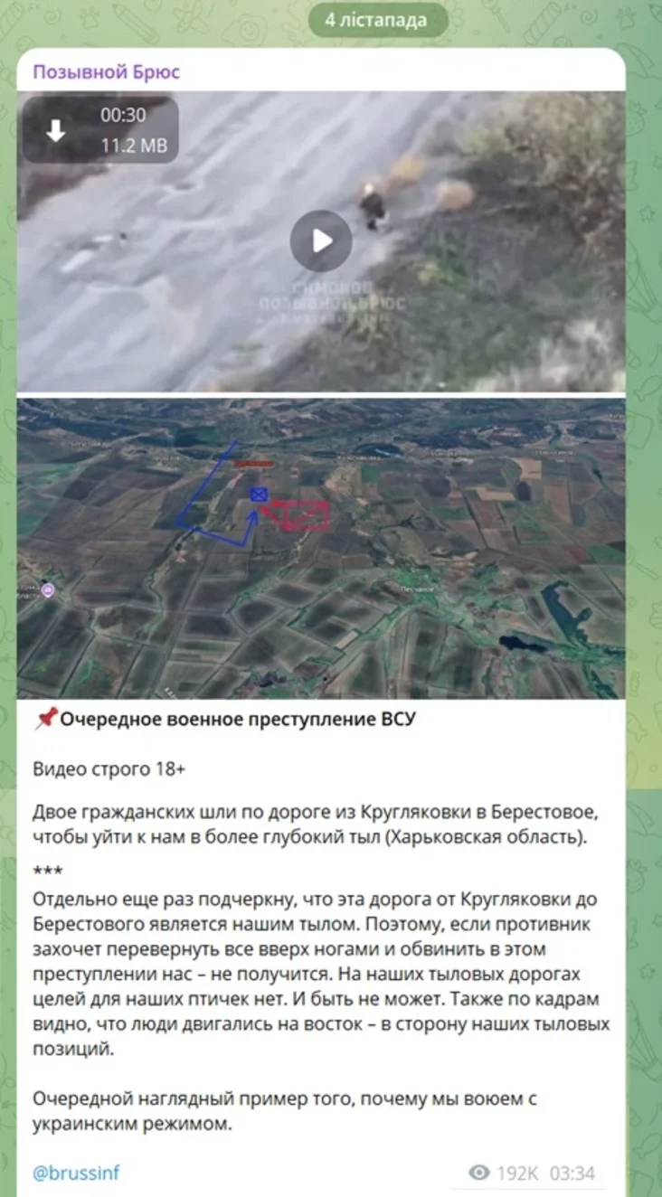 Авторы канала утверждают, что убийство произошло в Харьковской области на выходе из населенного пункта Петропавловка, которая находится на восток от Купянска в сторону российских позиций.