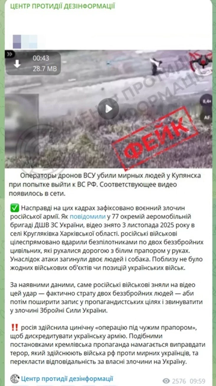 «На опубликованных кадрах зафиксировано военное преступление армии России: 03.11.2025 года в населенном пункте Кругляковка Харьковской области войска России совершили удар беспилотником по гражданским жителям, которые двигались по дороге под белым флагом», —