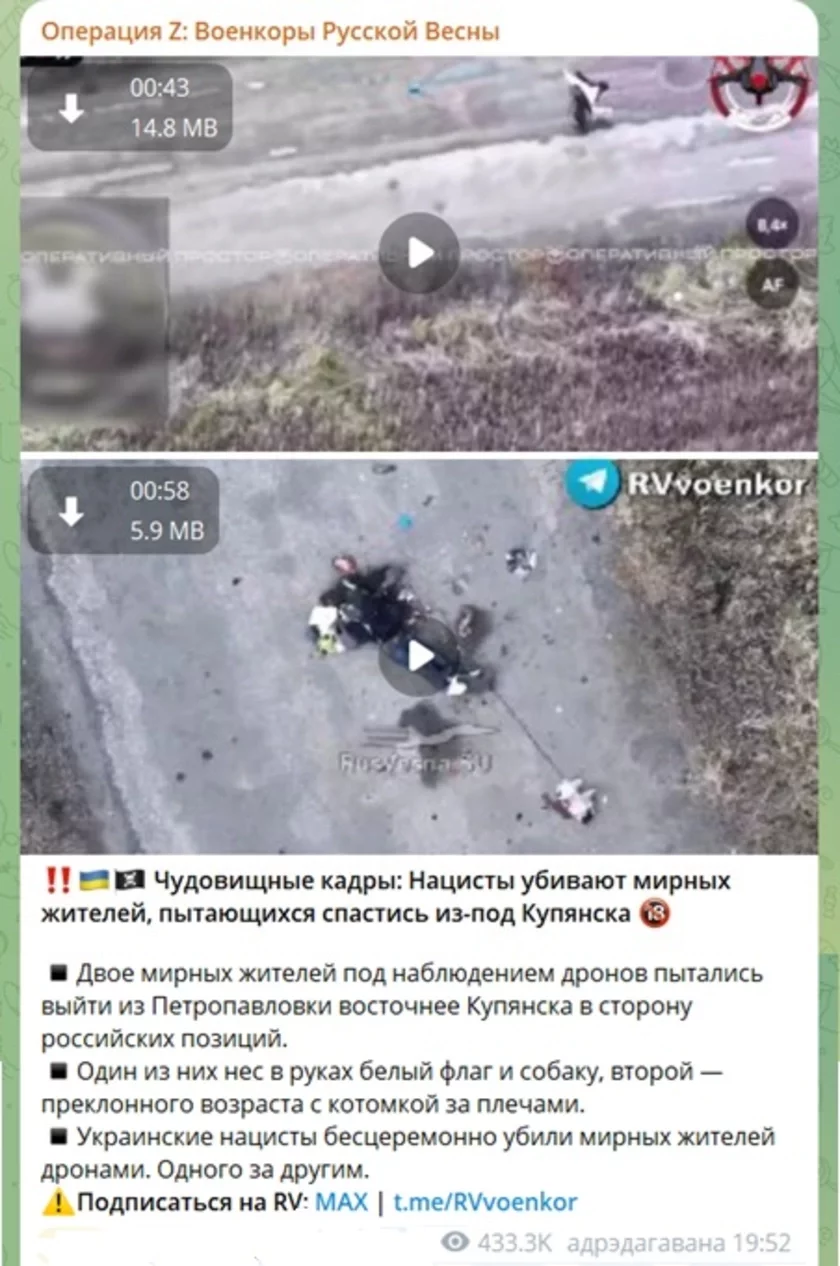«Чудовищные кадры: Нацисты убивают мирных жителей, пытающихся спастись из-под Купянска» — под таким заголовком вчера вечером в телеграм-канале «Операция Z: военкоры Русской Весны» было размещено видео. На нём видно, как по дороге идут два человека с собакой.