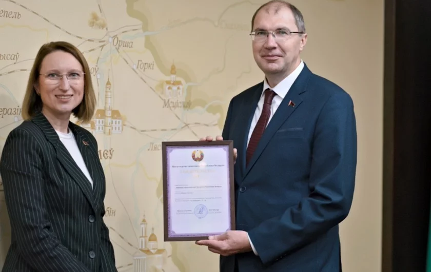 Сегодня заместитель министра экономики Мария Мажинская в торжественной обстановке вручила свидетельство №1 ректору Академии Денису Дуку.
