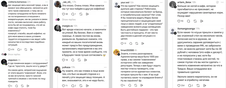 При этом подчеркивается, что сотрудник «Маркса» в ситуации с художницей тоже был не прав, так как по стандартам кофейни нельзя проявлять негостеприимное отношение к гостям. По этому поводу и прозвучали извинения.