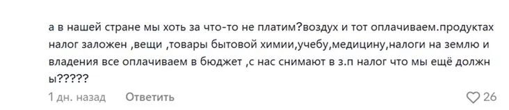 «А в нашей стране мы хоть за что-то не платим? Воздух и то оплачиваем. В продуктах налог заложен, в вещах, товарах бытовой химии, учебе, медицине, налоги на землю и владение. Все оплачиваем в бюджет, с нас снимают в з.п. налог. Что мы еще должны?????»