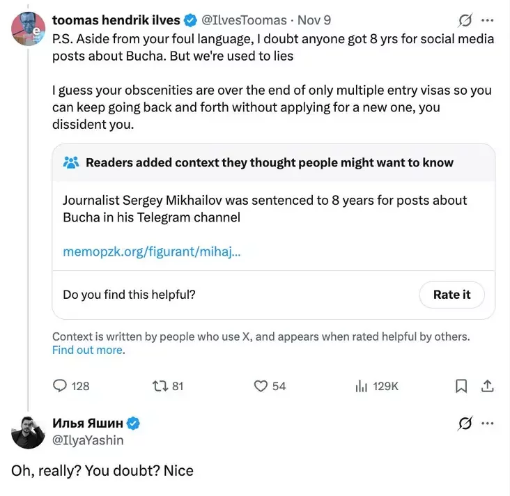 «Если не брать в расчет твоих ругательств, сомневаюсь, что кто-то получил восемь лет за посты в соцсетях о Буче. Но мы привыкли ко лжи. Полагаю, твои ругательства из-за отмены многократных виз — теперь не получится ездить туда-сюда без новой подачи, диссидент ты наш», — написал бывший президент Эстонии Тоомас Хендрик Ильвес в соцсети X в ответ одному из пользователей в дискуссии о шенгенских визах для россиян, пишет «Медуза».