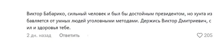 «Виктор Бабарико, сильный человек и был бы достойным президентом, но хунта избавляется от умных людей уголовными методами. Держись Виктор Дмитриевич, сил и здоровья тебе».