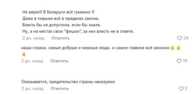 «Не верю!! В Беларуси всё гуманно!! Даже в тюрьме всё в рамках закона. Власть бы не допустила, если бы знала. Ну, а на местах свои «фишки», за них власть не в ответе».