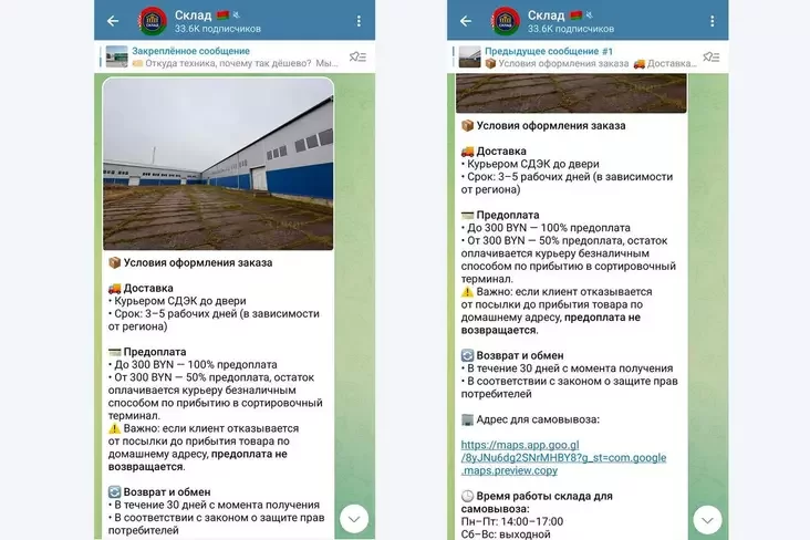 Подобная схема мошенничества зафиксирована и в телеграме — в канале под названием «Склад», где много подписчиков и публикуются якобы «реальные» фото таможенных складов. «Продавцы» обещают доставку «до двери», но требуют оплатить либо всю сумму, либо половину цены заранее. После получения денег они исчезают и не выходят на связь.