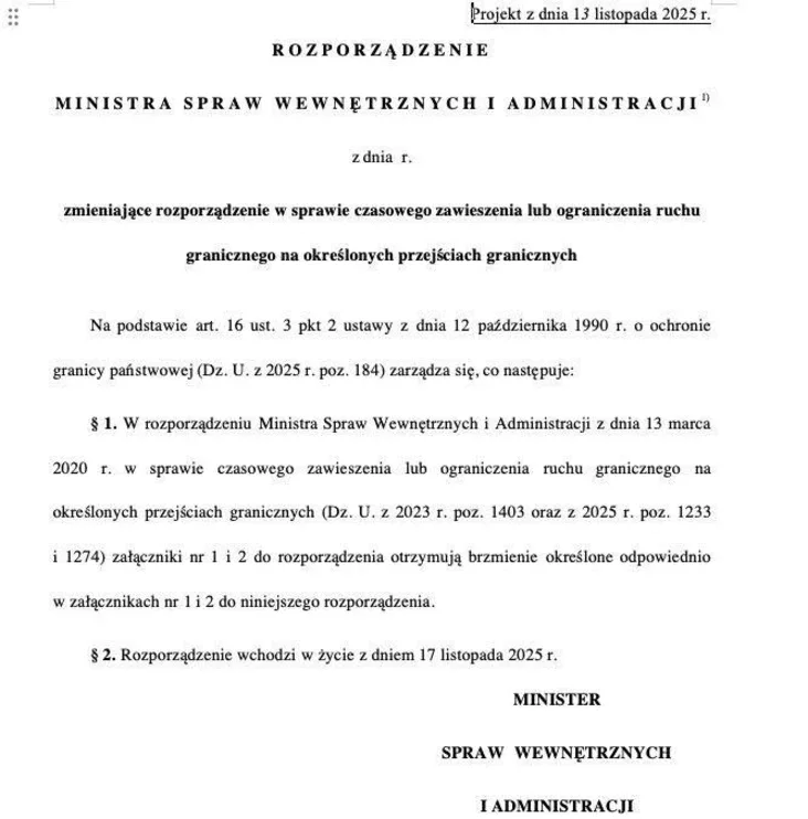 Согласно проекту распоряжения, 17 ноября 2025 г. будет возобновлено пограничное движение на двух дорожных пограничных переходах, сообщает Pap.pl.