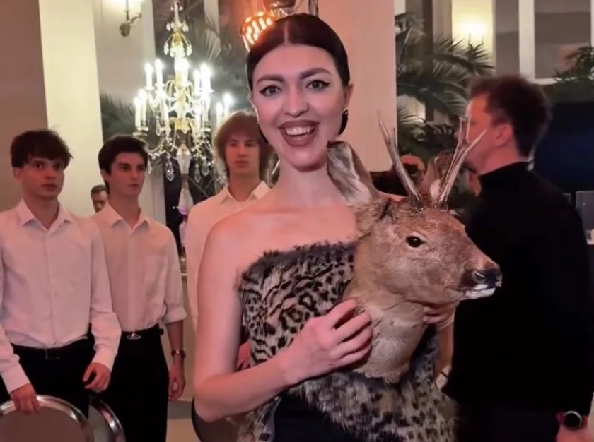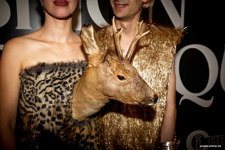 Дизайнер Алёна Ацапкина пришла в черном платье, драпированном мехом, с головой косули с позолоченными рогами.
