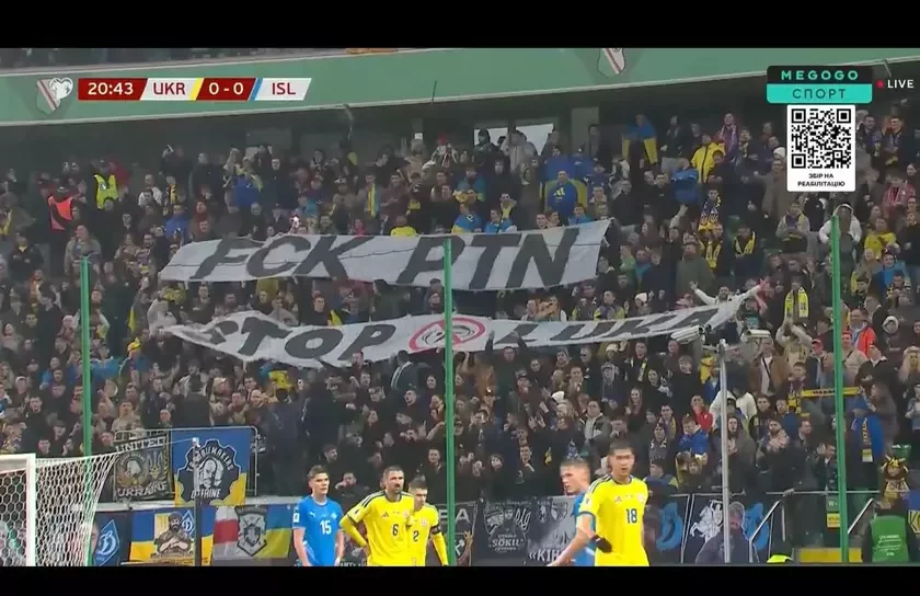 На матч Украина — Исландия в Варшаве пронесли большие растяжки «Ф*к Путин» и «Стоп Лука»