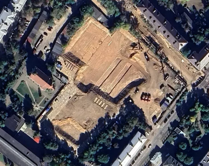 Новые снимки подтверждают, что прежние оценки масштабов этой почти секретной стройки были точными: гигантский котлован «проглотил» практически всю свободную территорию квартала. Это означает, что под ковшами экскаваторов оказалась большая часть исторического Золотогорского кладбища, которое существовало здесь еще с конца XVIII века.