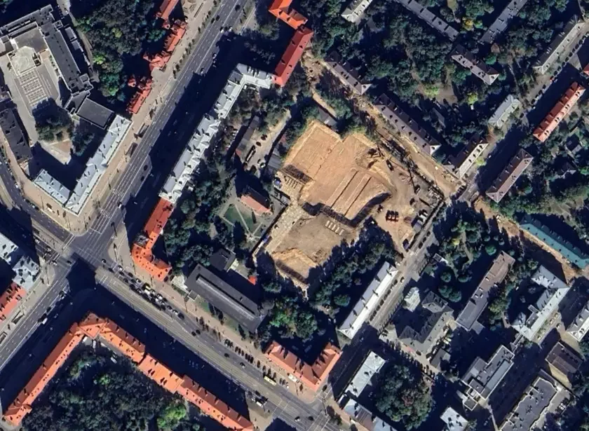 Одно из самых заметных пятен на спутниковых фото — квартал за костелом Святой Троицы (Святого Роха) на Золотой Горке. Здесь ведется строительство нового корпуса Академии национальной безопасности — учреждения, которое готовит кадры для КГБ.