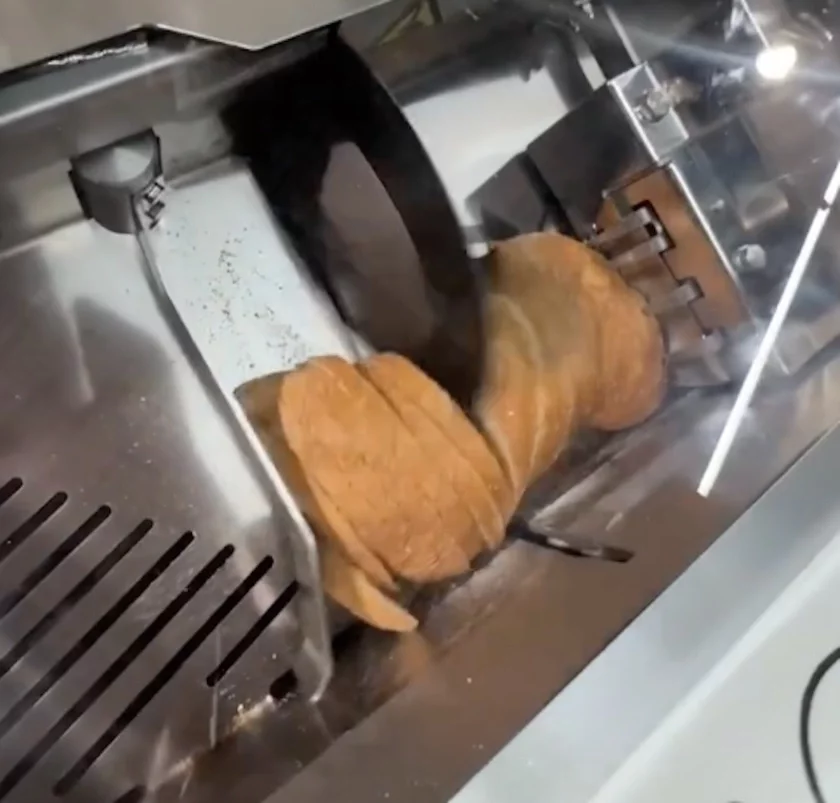 Слайсер на видео выглядит как машина с отсеком и автоматическим ножом. Механизм работает только в закрытом виде.