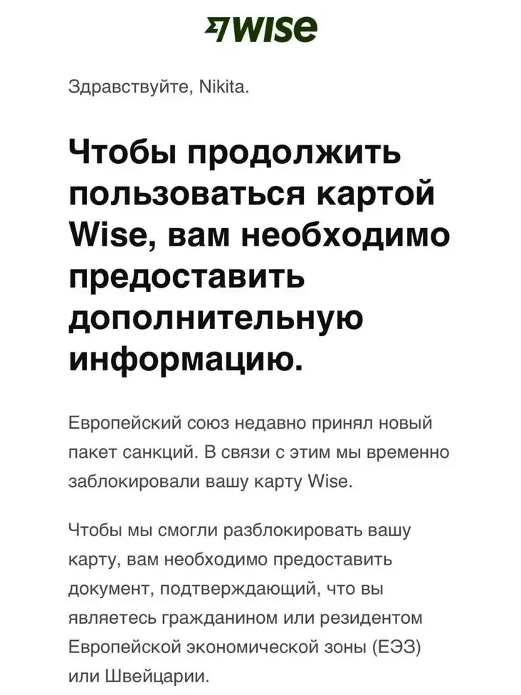 Пользователи, у которых уже есть карты Wise на основании визы D, также должны предоставить ВНЖ, чтобы продолжать пользоваться сервисом.