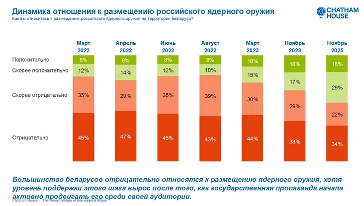 Поддержка решения о размещении ядерного оружия за два года заметно выросла — с 33% в ноябре 2023 года до 45% в ноябре этого года, хотя большинство — 56% — все еще выступает против. Рост показателя поддержки авторы исследования объясняют влиянием государственной пропаганды.