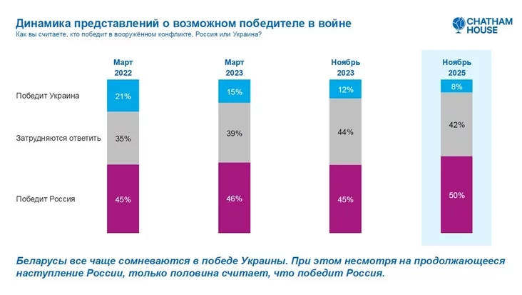 При этом за последний год белорусы стали меньше верить в победу Украины — таких только 8% (год назад было 12%). О том, что победит Россия, высказался каждый второй опрошенный. Но и большой процент тех, кому было трудно ответить — 42%.