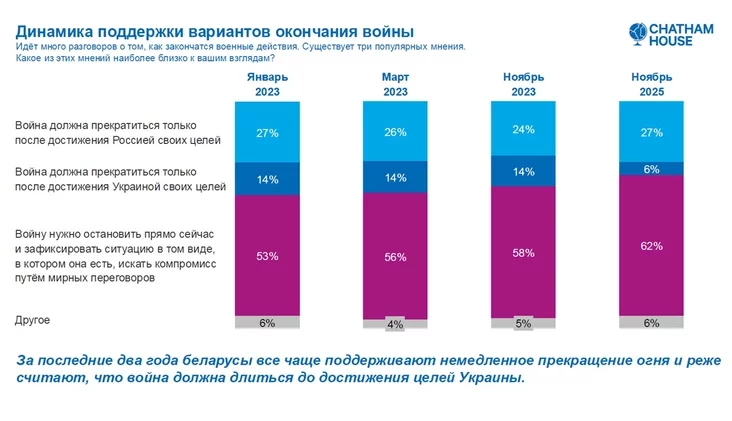 Поддержка России в войне остается относительно низкой, о ней заявляют только 27% белорусских городских жителей. При этом большинство белорусов хотели бы немедленного прекращения военных действий и начала переговоров. И эта цифра растет на протяжении двух лет.