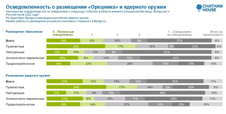 Результаты опроса продемонстрировали слабую осведомленность белорусов о деталях военного сотрудничества с Россией. Так, только около трети опрошенных заявили, что знают о планах размещения комплекса «Орешник» и тактического ядерного оружия (соответственно 32% и 33%).