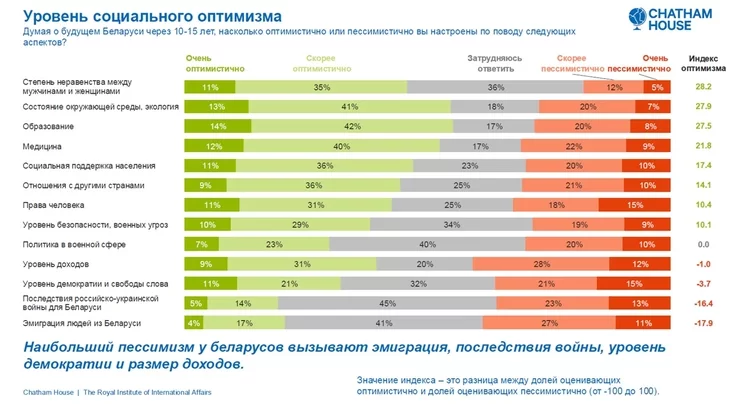 Белорусы склонны пессимистично оценивать последствия российско-украинской войны, а также эмиграцию населения. Немного оптимизма вызывает и ситуация со свободой слова и уровнем доходов.