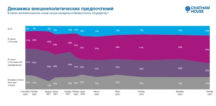 Во внешней политике белорусы чаще всего поддерживают союз с Россией. За это высказались 44% опрошенных. И это наибольший показатель за пять лет опросов.