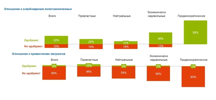 Белорусы разных политических взглядов позитивно относятся к освобождению политзаключенных (только 15% выражают неодобрение). Тогда как к планам привлечь трудовых мигрантов — преимущественно негативно.