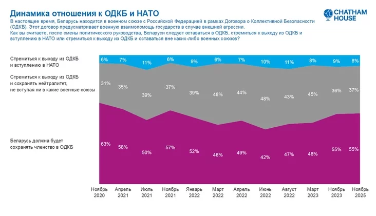 Что касается различных военных блоков, то за вступление в НАТО после смены политического руководства в стране высказались только 8% белорусов. Почти на том же уровне (37%), что и два года назад, осталось количество белорусов, которые считают, что Беларуси необходимо будет стремиться к нейтралитету, и тех, кто считает, что она должна будет оставаться в ОДКБ (55%).