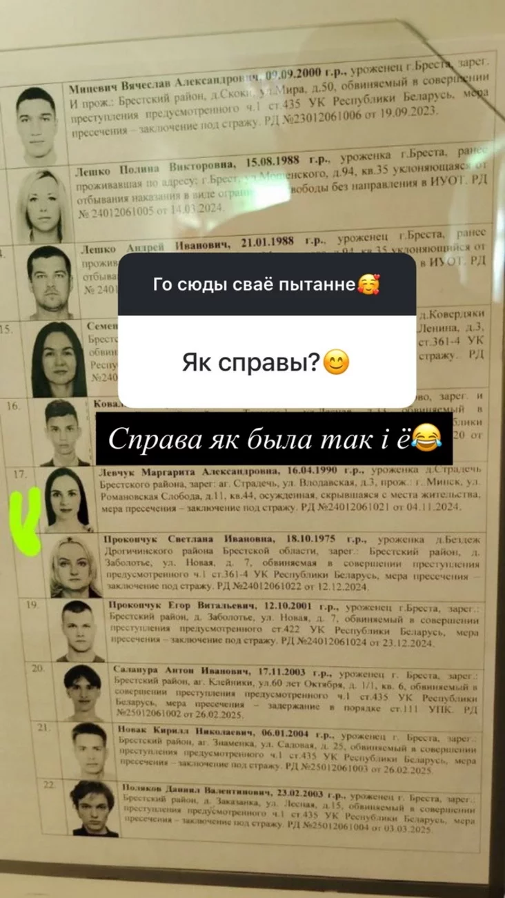 Правозащитный центр «Вясна», просмотрев фото, которое выставила Левчук, заметил, что вместе с ней в этой ориентировке есть также брестские фигуранты «дела хороводов» Андрей и Полина Ляшко, которые якобы «уклоняются от отбытия наказания на «домашней химии»».