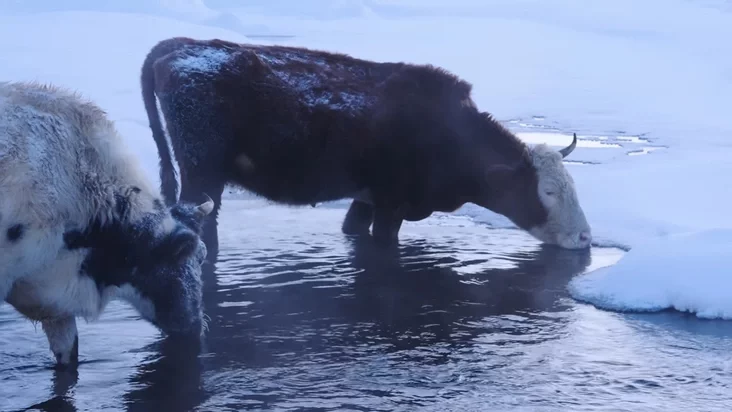Из-за отсутствия водопровода животных каждое утро приходится гонять на водопой к реке. Это кажется невероятным, но даже при таких экстремальных температурах в одном месте река не замерзает. Секрет в том, что именно здесь бьют теплые подземные источники.