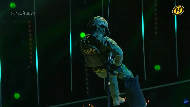 Но вдруг посреди песни на сцену сверху спустилась «группа захвата» в форме с надписями «СОБР» (специальный отряд быстрого реагирования) на спине и с автоматами в руках. Они разбежались по разным углам, будто ища преступников. К ним присоединились военные с овчарками, которые тоже начали ходить по сцене, будто проверяя ее на наличие запрещенных предметов.