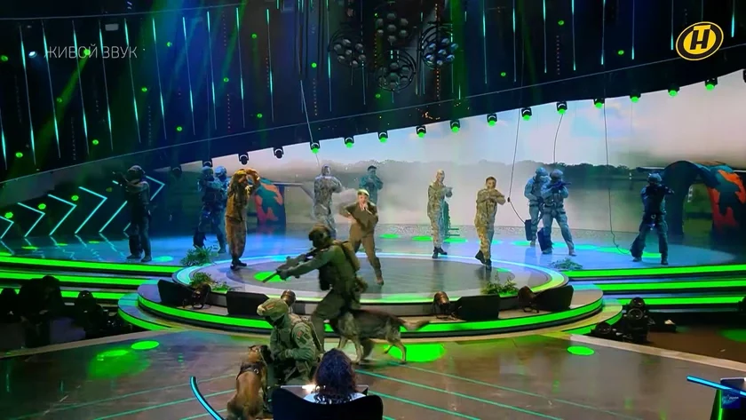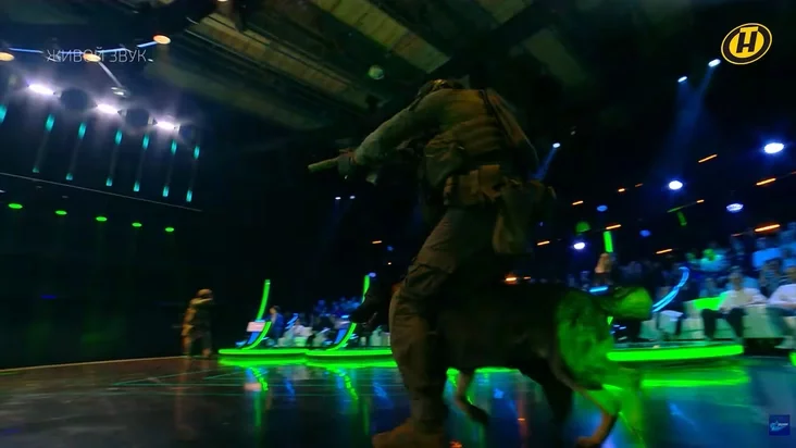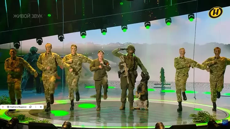 В финале в одном ряду с солистом и подтанцовкой стоял военный с закрытым лицом и овчарка.