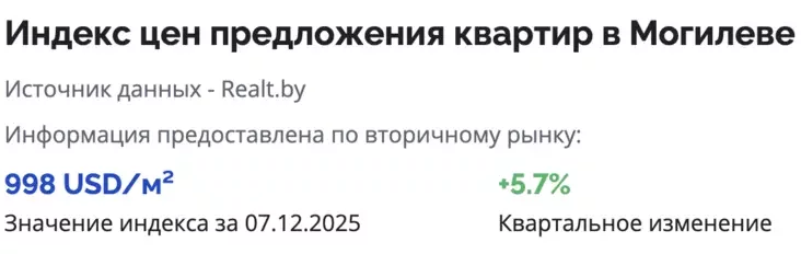 На начало декабря 2025 года квадрат в Могилеве в среднем оценивают в $998. В прошлом году за квадрат в Могилеве в среднем просили по $840. Годовой прирост составил более 18%.