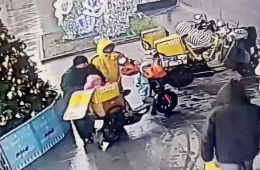 На кадрах зафиксировано, как курьер в желтой форме подъезжает на скутере к торговому центру и достает из закрепленной на багажнике термосумки маленького ребенка.