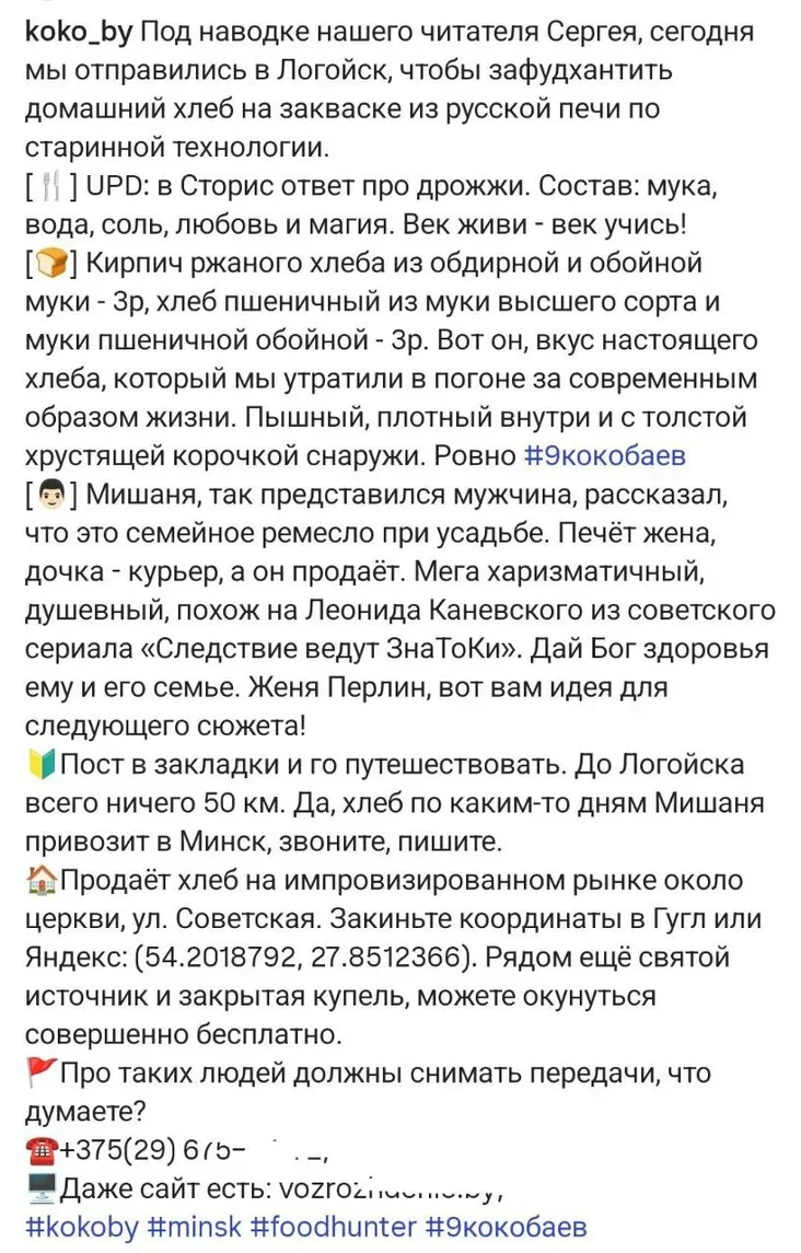 Дядя Миша (или даже просто Мишаня) в Логойске личность знаменитая. Мужчина печет хлеб в русской печи по рецептам 200‑летней давности. Продает прямо со своего автомобиля, паркуется обычно недалеко от святого источника Николая Чудотворца.