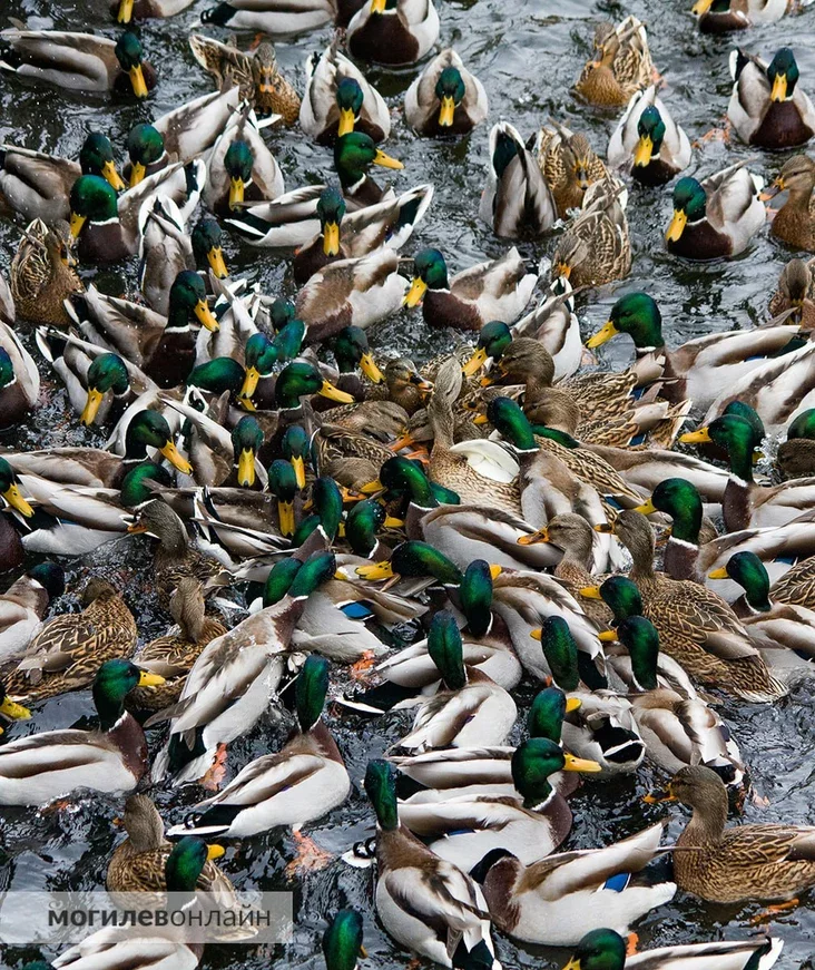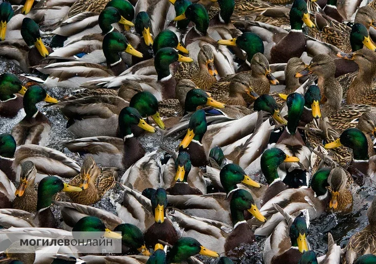 Сотни уток заполонили реку в Могилеве. В теплые края не улетели, потому что слишком сытно живется рядом с человеком