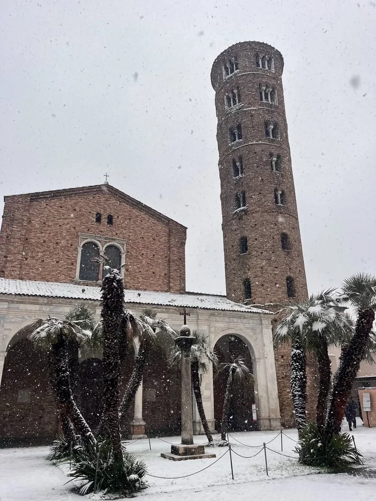 Заснеженная базилика Сант-Аполлинаре-Нуово в итальянской Равенне. Фото из соцсетей