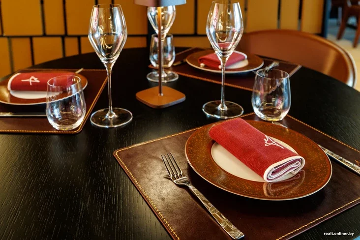«Нам было очень важно передать атмосферу ресторана даже в деталях. Взять хотя бы сервировку столов. Подложки под тарелки и подставки под стаканы сделаны из натуральной кожи. Мы сами ездили на производство, расположенное в Беларуси, и выбирали эту кожу. Сервировочные салфетки вышиты вручную местными мастерами. Что касается посуды, было важно выбрать именно качественную, эстетичную и текстурную посуду. Ее специально заказывали для отеля у немецкого бренда Rosenthal. Посуда классическая, но имеет фирменную расцветку ресторана».