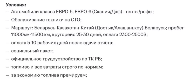 Водителям, которые должны выполнять рейсы по маршруту Беларусь — Казахстан — Китай, обещают 2300—2500 долларов (около 2100—2300 евро) в месяц.