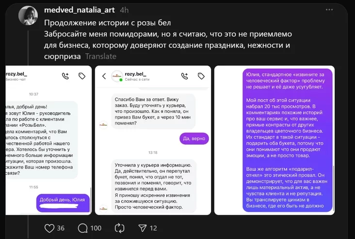 Но Наталья считает, что простое «извините» — это этический провал, так как компания не обращает внимания на чувства клиента. Курьера ей жаль, но «профессионализм это не отсутствие ошибок, а правильные действия после них». Женщина пишет, что подарить и забрать — это приблизительно как попросить прощения, ударив по лицу. Поэтому, по ее мнению, было бы правильно оставить оба букета.