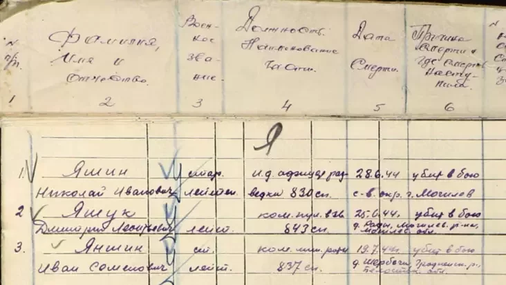 Донесение от 28 июня 1944 года со сведениями о гибели Николая Яшина на северо-восточной окраине Могилёва. Фото: pamyat-naroda.ru