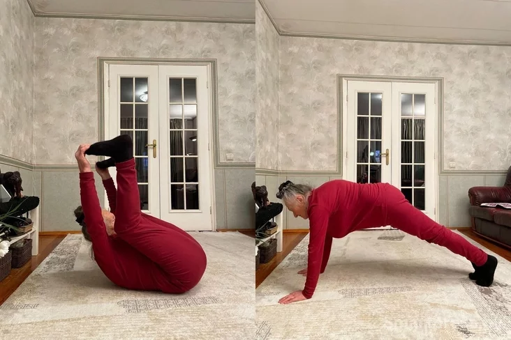 Упражнения Екатерины Парфеновны такие: легкая ходьба-бег, наклоны вперед с касанием пола, вращение туловища, разведение рук в стороны. Пенсионерка замечает, что за один подход может 30 «уголков» ногами сделать (подъем ног лежа на спине).