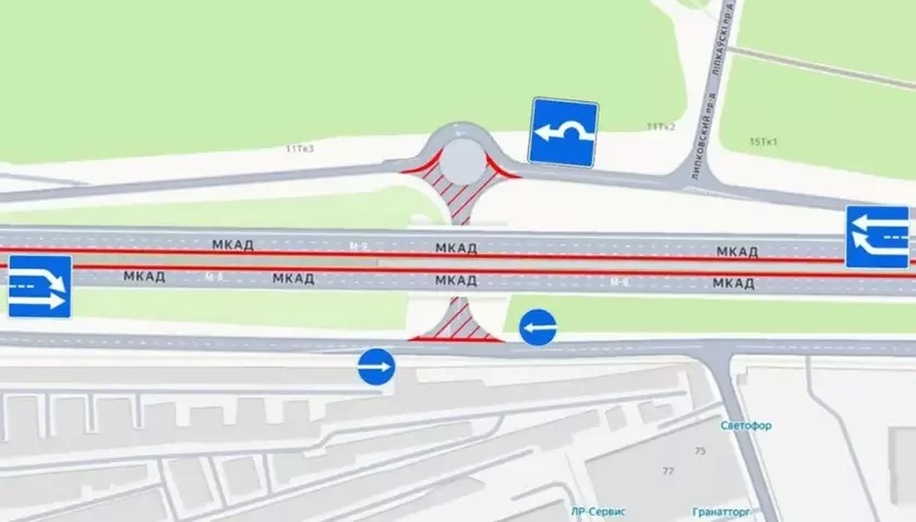 В связи с ремонтными работами с 20 февраля на этом участке МКАД количество полос в обоих направлениях уменьшили с трех до двух. Кроме того, движение всех видов транспорта под мостом полностью ограничено.