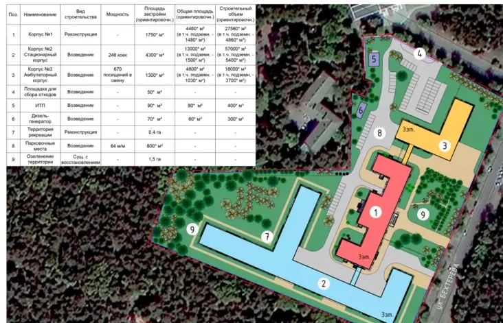 Самым масштабным объектом будущей стройки станет стационарный корпус, общая площадь которого составит около 13 000 квадратных метров. Рядом с ним появится меньший по размерам амбулаторный корпус площадью около 4 800 квадратных метров.