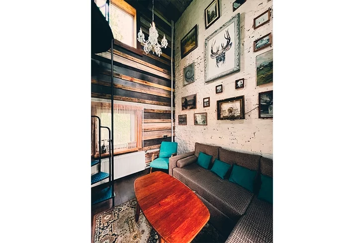 На первом этаже расположены мини-кухня и санузел. Второй уровень занимает гостиная с электрическим камином, большим телевизором и высокими потолками — около 6 м. На третьем этаже находится спальня с видом на вершины сосен.
