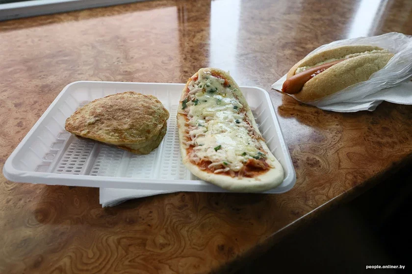 На витрине — меню конкретно этого дня. В наличии есть все: более 25 позиций готовых блюд — от пиццы и гамбургера до блинов и беляшей. Дороже всего «Котлета киевская жареная» — 5,50, дешевле всего — пирожки с повидлом, капустой или рисом и яйцом по рублю, а вот с ветчиной и сыром — уже по 3. Правда, и вес последних почти вдвое больше.