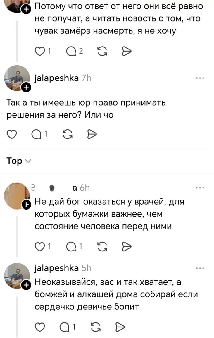 Тут Алексей снова отреагировал специфически. На фразу «не дай бог оказаться у докторов, для которых бумажки важнее, чем состояние человека перед ними» ответил: «Не оказывайся, вас и так хватает, а бомжей и алкашей дома собирай, если сердечко девичье болит».