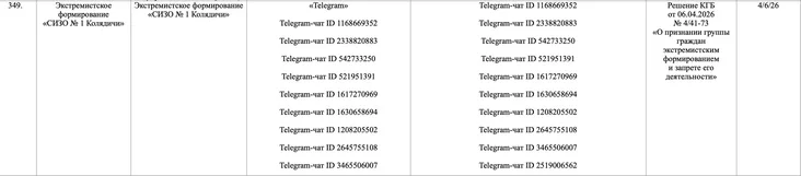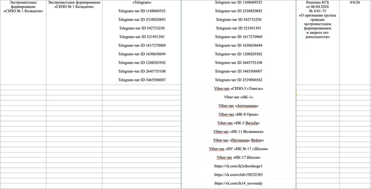 6 апреля 2026 года КГБ принял решение о признании экстремистским формированием чата «СИЗО №1 Колядичи». Это уже несуществующий чат родственников арестантов, в котором обсуждались вопросы о том, что можно класть в передачу, а что нельзя, как правильно отправлять посылки и по какому графику работает СИЗО. В пиковый момент в нем было около 1900 человек, но после того, как чат признали «экстремистскими материалами», администраторы удалили его.