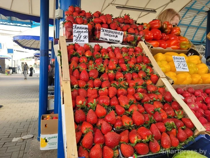 Клубники достаточно много, вся ягода крупная, ярко-красная, в лотках и на вес. По вкусу — не водянистая, хотя и не имеющая того сладко-сезонного вкуса и аромата, как домашняя белорусская клубника, появляющаяся обычно во второй половине июня.